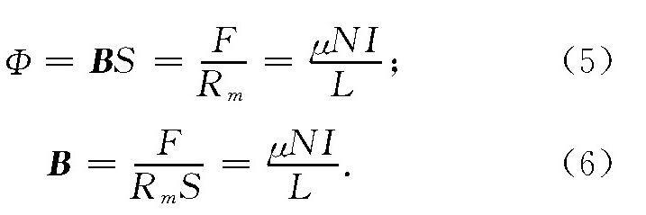 式中S为磁路的平均面积, μ为介质磁导率.由磁场欧姆定律[9]可得磁通量Φ
